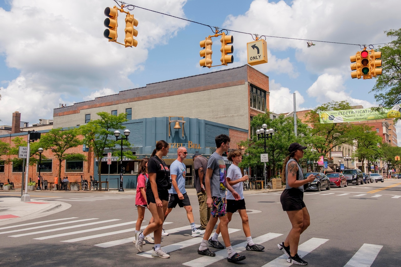 Pedestrians cross Main Street at Liberty Street in Downtown Ann Arbor on Thursday, July 25, 2024.Jacob Hamilton | MLive.com