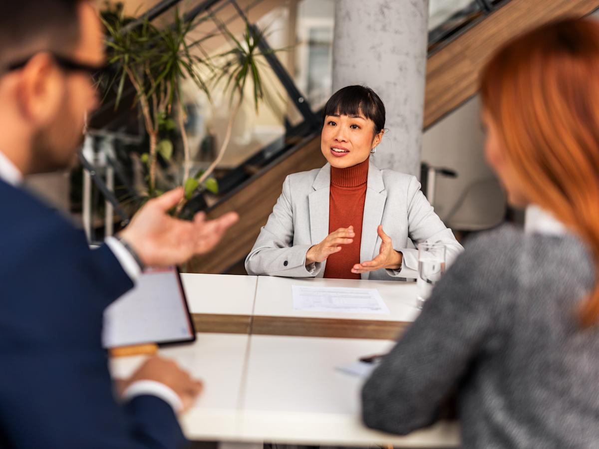 A woman sitting at a table facing a man and a woman during an interview