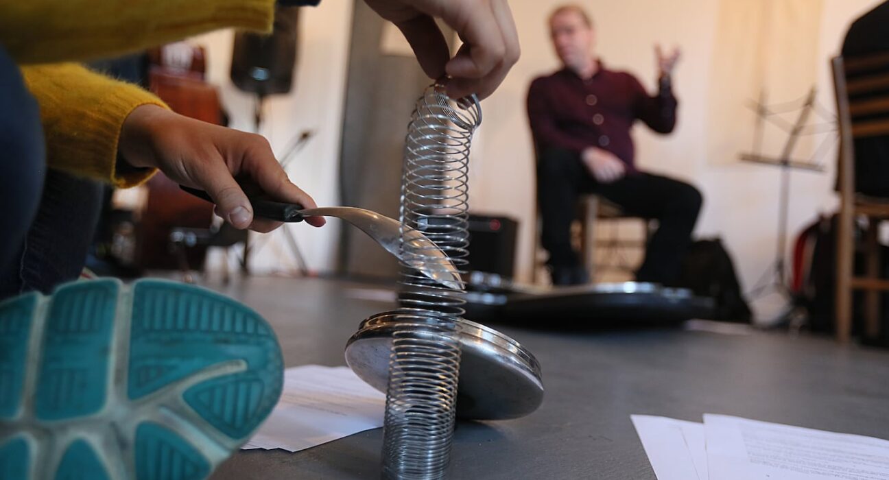 Explaining his piece to a group of guest artists and community members before playing through it, Pisaro encouraged all present to listen to one another. He emphasized his lack of a concrete vision for the piece, which can be performed by any group of instruments, voices, and other sound-making materials. “You’re going to learn as much from sounds that other people make as you learn from sounds that you make,” he said. “When someone makes a sound, the silence following the sound is kind of the most critical thing.”